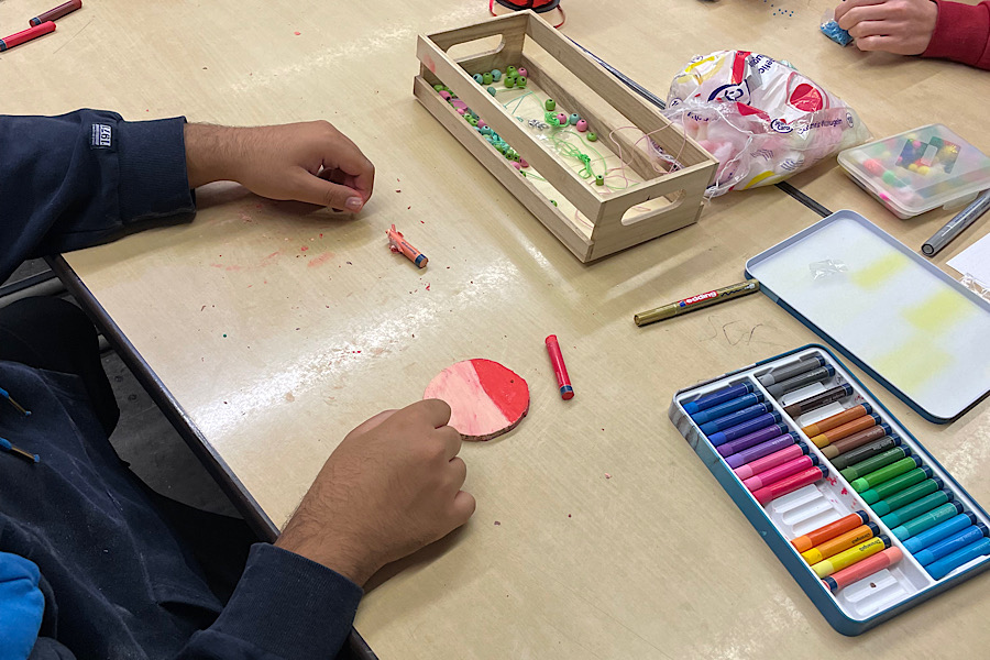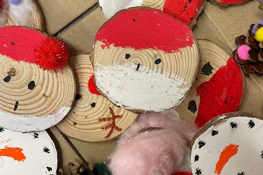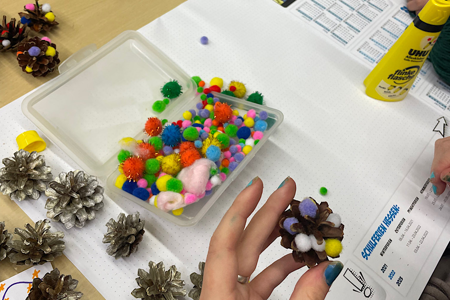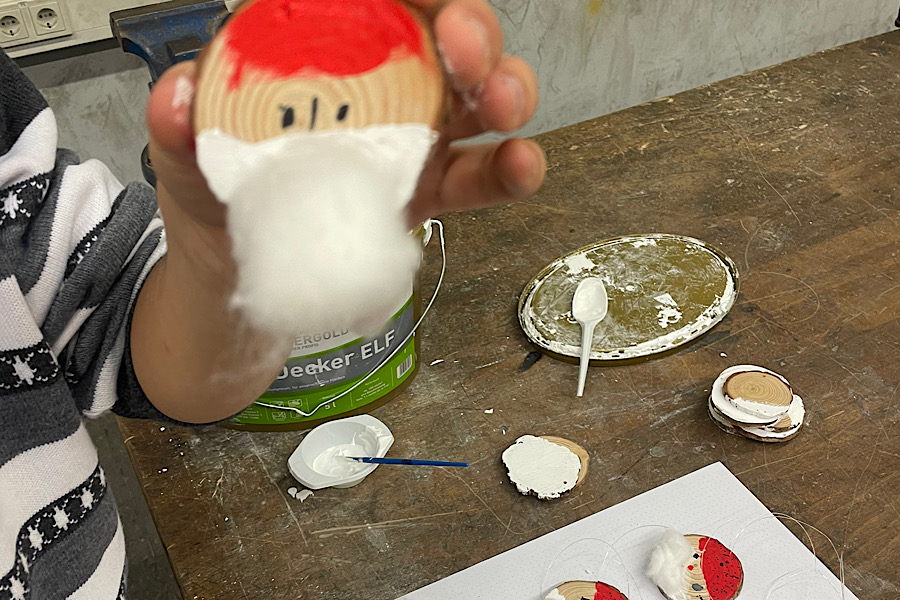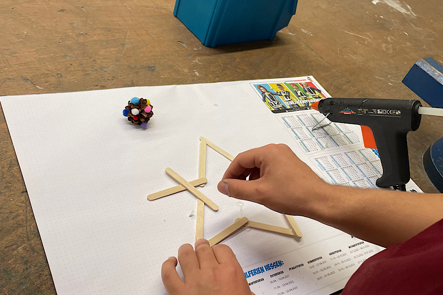 Bei den verschiedenen Arbeitsschritten wie Abrunden, Schleifen, Anzeichnen und dem Bohren von Löchern konnten alle Schülerinnen und Schüler ihren Teil zum Bau des Baumes beitragen. Bei der anschließenden Herstellung des Weihnachtsbaumschmucks gestaltete die Klasse den Schmuck individuell, sodass der Weihnachtsbaum die unterschiedlichsten Motive trägt.
