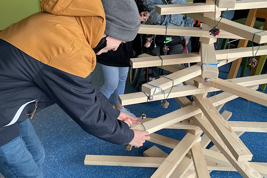 Nachdem die Schülerinnen und Schüler der Reha-Berufsschulklasse der Lebenshilfe im letzten Schuljahr kleine Weihnachtsbäume aus Holz gestaltet haben, ging es in diesem Jahr mit der Unterstützung von Herrn Kingen an den Bau eines großen Weihnachtsbaumes.