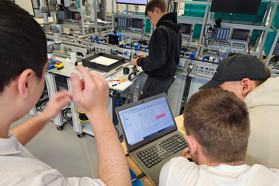 Unser hochmodernes Technologiezentrum bietet vielseitige Möglichkeiten, technischen Unterricht praxisnah und innovativ zu gestalten. In der „Lernfabrik 4.0“ können Lernende verschiedener Fachrichtungen ihre Kenntnisse vertiefen, da die Anlage gleichermaßen Inhalte aus der Elektrotechnik sowie der Anlagentechnik und Informatik abbildet.