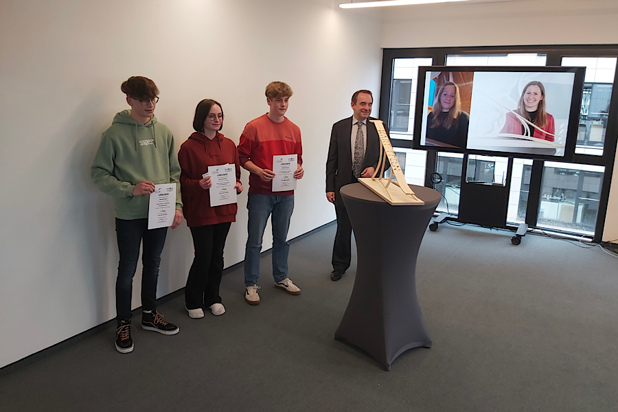 Mit Hochspannung hat der betreuende Fachlehrer Guido Kingen mit seinem Team „Kartoffeln“ bestehend aus der Lerngruppe der BG-Bautechnik Evelyn Dinkel, Tim Isenberg und Gero Spiekermann die Preisverleihung verfolgt.