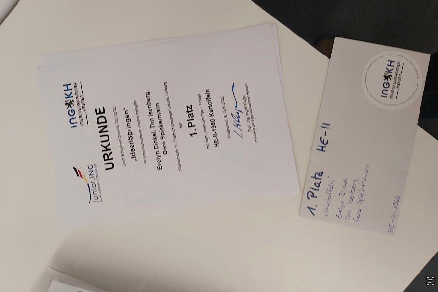 Am letzten Freitagnachmittag vor den Osterferien wurden nur die Teams eingeladen, die einen Preis gewonnen haben. Von unserer Schule hat nur ein Team eine Einladung zur Preisverleihung, die coronabedingt nur in einem kleinen Rahmen in den Räumlichkeiten der Ingenieurkammer in Wiesbaden stattgefunden hat, bekommen. Die Jahre zuvor wurden alle Teilnehmer des Wettbewerbs in das Kongresszentrum nach Gießen eingeladen.