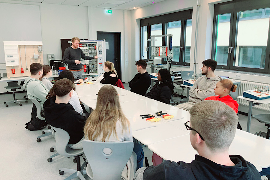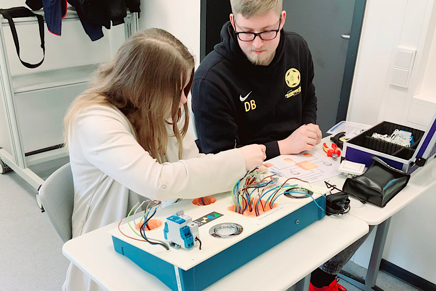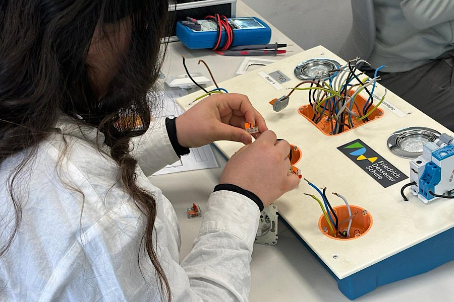 Auszubildende des dritten Lehrjahres gaben den Teilnehmerinnen einen Einblick in den Ausbildungsberuf der Elektronikerin für Energie- und Gebäudetechnik. Hier ging es um die Verkabelung von Steckdosen und Lichtschaltern sowie dem fachgerechten Durchmessen der Schaltung.