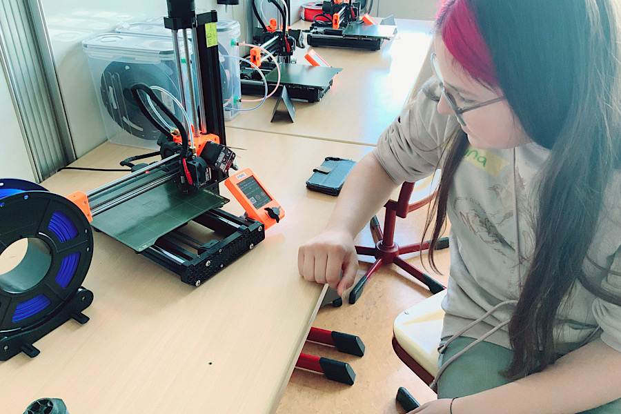 Im „FabLab“ der Friedrich-Dessauer-Schule konstruierten die Teilnehmerinnen dann mit der Online-Software „TinkerCAD“ Bauteile, die sie im Anschluss mit den 3D-Druckern der Schule ausdruckten und mit nach Hause nehmen konnten.
