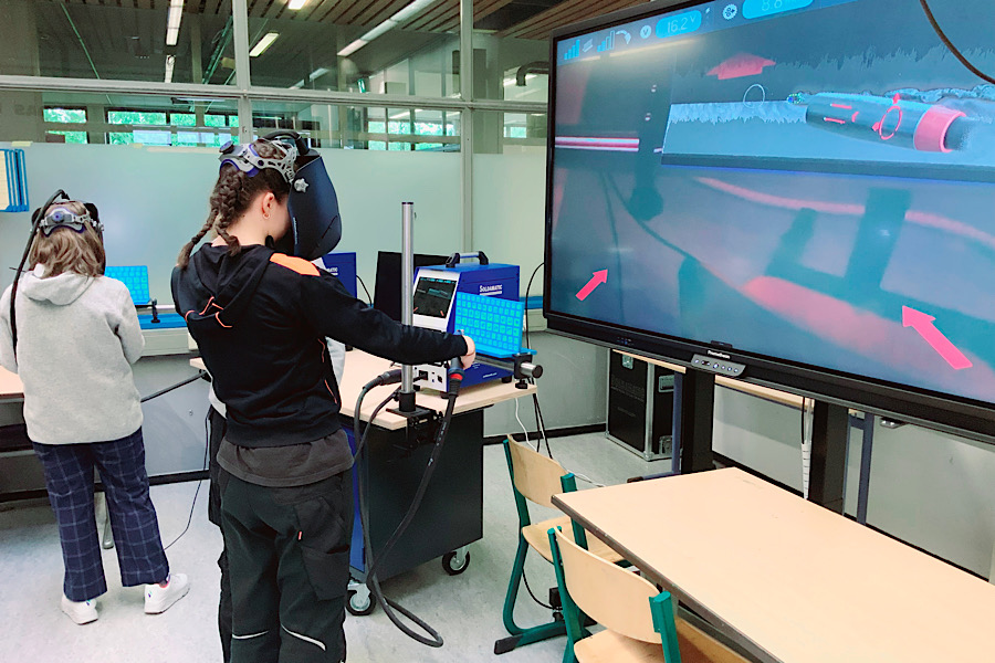 Gemäß der Ausbildung zur Industriemechanikerin konnten die Schülerinnen beim virtuellen Schweißen mit einer AR-Brille das gefahrlose Fügen von Stahlbauteilen austesten.