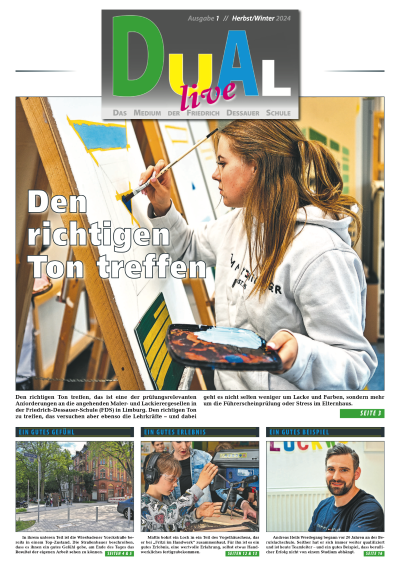 Die Zeitung wird gerne auch als Klassensatz an alle Schulklassen verteilt, die mit der „DUAL live“ arbeiten wollen. Sie können einen Klassensatz über folgende Email-Adresse anfordern: bzw. direkt an der Friedrich-Dessauer-Schule in Limburg abholen.