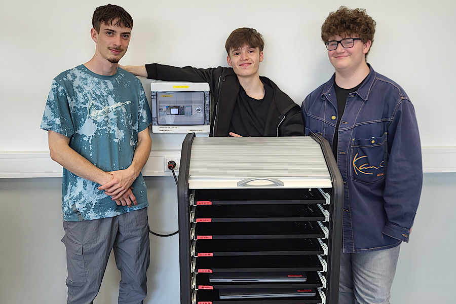 Weiterhin wurde eine zeitgeführte Ladestation für Laptops entwickelt, programmiert, montiert und in Betrieb genommen. Hierdurch wird überflüssiger Energieverbrauch und vorzeitiger Akkuverschleiß auf ein Mindestmaß reduziert.