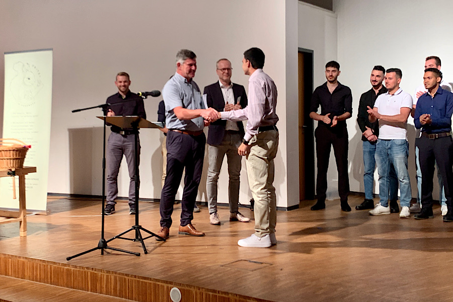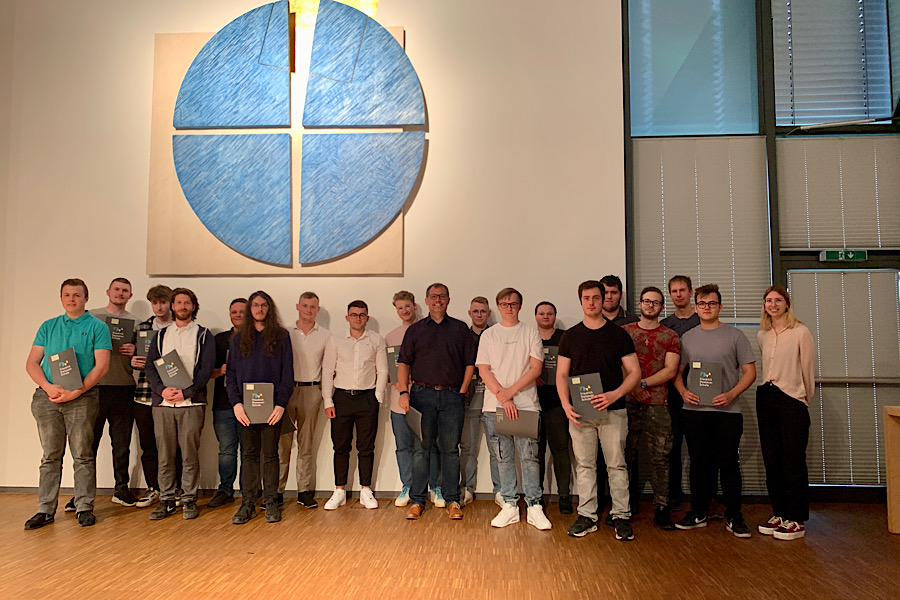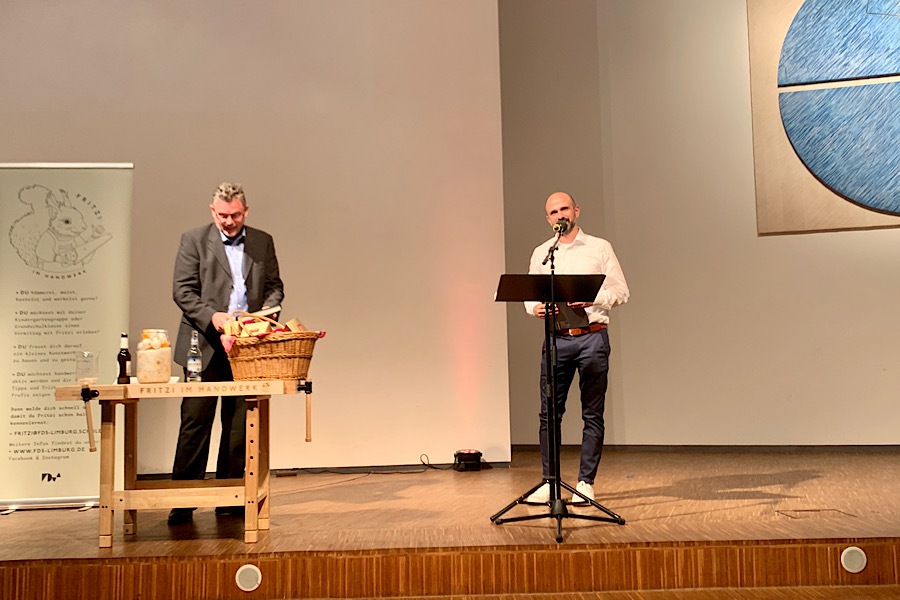 Zunächst gratulierte Schulleiter Stefan Laux allen Absolventinnen und Absolventen zu ihrem Berufsschulabschluss und würdigte ihre Leistungen. Neben Lob und Anerkennung gab er ihnen aber auch viele Weisheiten mit auf den Weg – so sei es besonders wichtig, sein Lebensglas mit der richtigen Mischung aus wichtigen Dingen (z.B. Liebe, Familie, Freunde) und eher nebensächlichen Dingen (z.B. Zeit für Social Media) zu füllen. Herr Dr. Bartels von der IHK schloss sich diesen Worten an und betonte nochmals die Wichtigkeit einer fundierten Ausbildung in den Bereichen Elektro- und Informationstechnik, Metalltechnik sowie Bautechnik für die zukünftige Arbeitswelt. Ebenfalls ließ der Vorsitzende des Fördervereins, Helmut Laukötter, die letzten Jahre mit den Absolventen und Absolventinnen Revue passieren und machte an dieser Stelle auf den „Fofritz“- Preis aufmerksam. Dieser war für Schülerinnen und Schülern mit den besten Leistungen ihres Fachbereiches vorgesehen. Doch nicht nur herausragende Leistungen, sondern auch ein besonderes soziales Engagement wurden mit einem „Limburger Küsschen“ aus dem heimischen Schokoladenhaus Limburg belohnt.